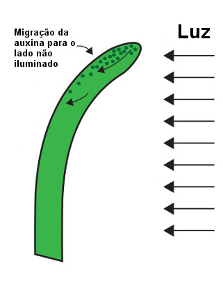 Nessa figura, percebemos a migração da auxina e a curvatura proporcionada pelo aumento das células do lado não iluminado. A redistribuição da auxina é mediada por um fotorreceptor.